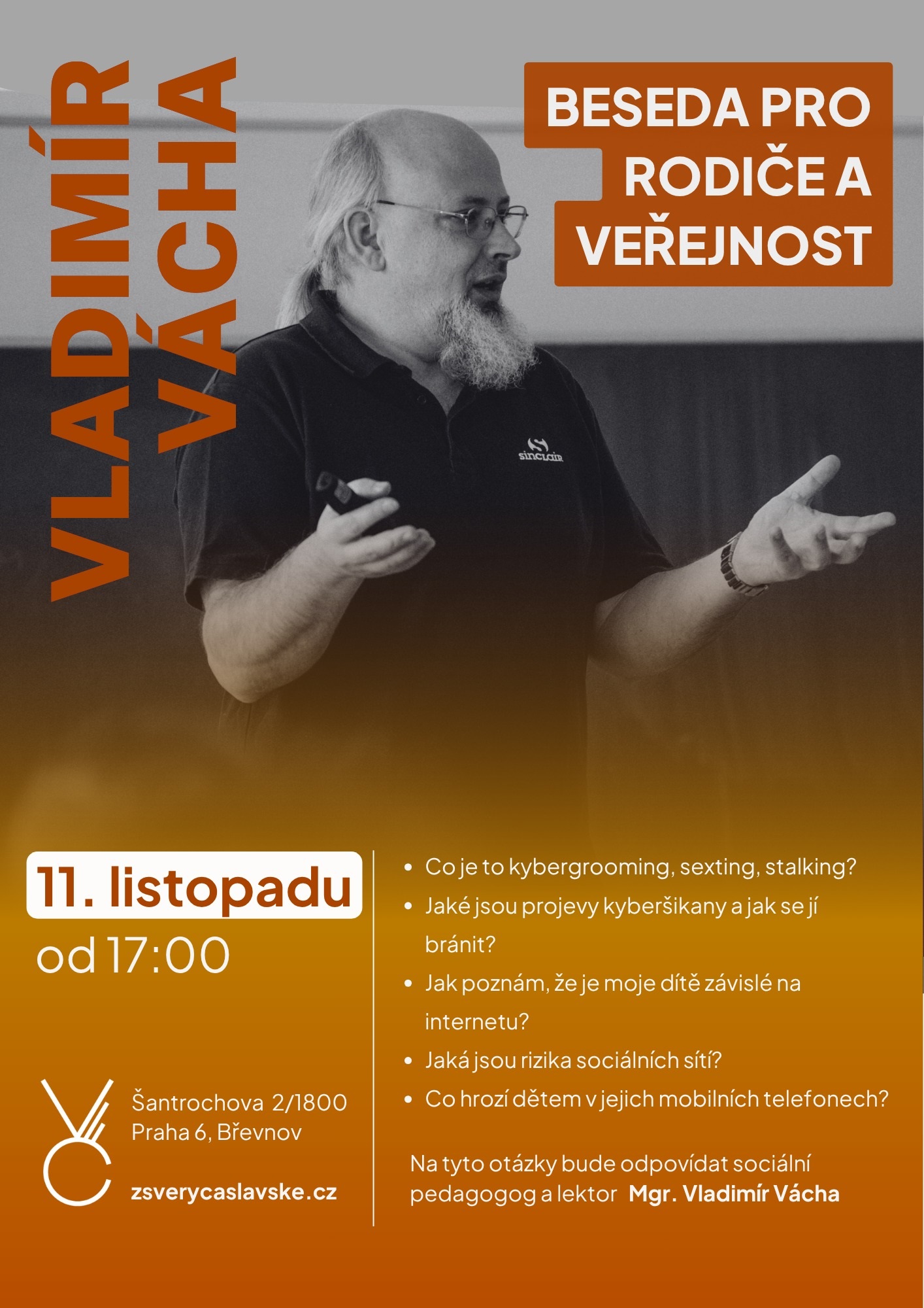 Jeho přednáška měla mezi rodiči velký ohlas – a i tentokrát se můžete těšit na otevřenou diskusi o důležitých tématech, která se týkají dětí, internetu a sociálních sítí.